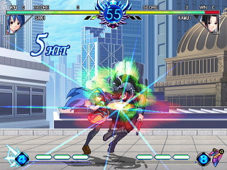 1ラウンドに1回のみ、ABCボタン同時押しで特殊能力「アルカナフォース」が使用可能。発動モーション自体は、緊急回避として使えるほか、発動中は強力な必殺技「アルカナブレイズ」が使用可能に。キャラクターが同じでも、選択するアルカナが異なることにより、戦略の組み立て方が異なり、この辺りがゲームの駆け引きの奥深さを引き出していると言って良いでしょう。